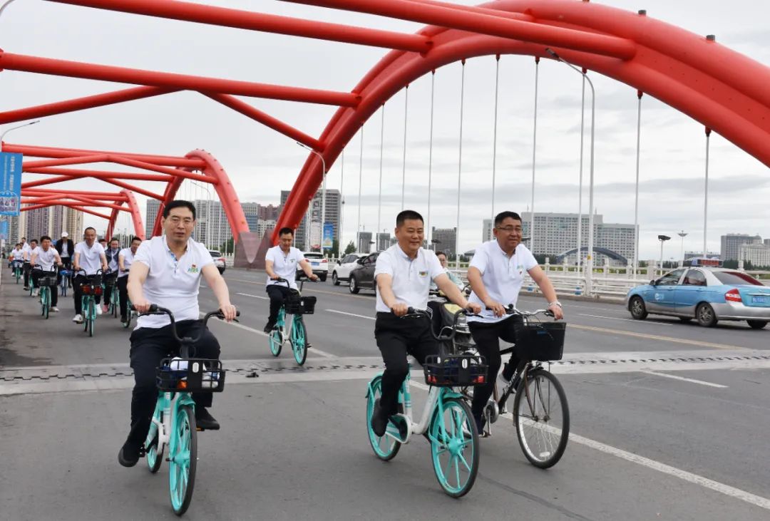 上午7时50分,32人组成的骑行队伍从公司出发,途经市政府办公大楼、胜利路大桥、霍林河大街,到达活动目的地通辽文化体育广场。骑行车队一路向前,神采飞扬,绿色出行,成为一道亮丽的城市风景线,吸引了众多路人的目光。